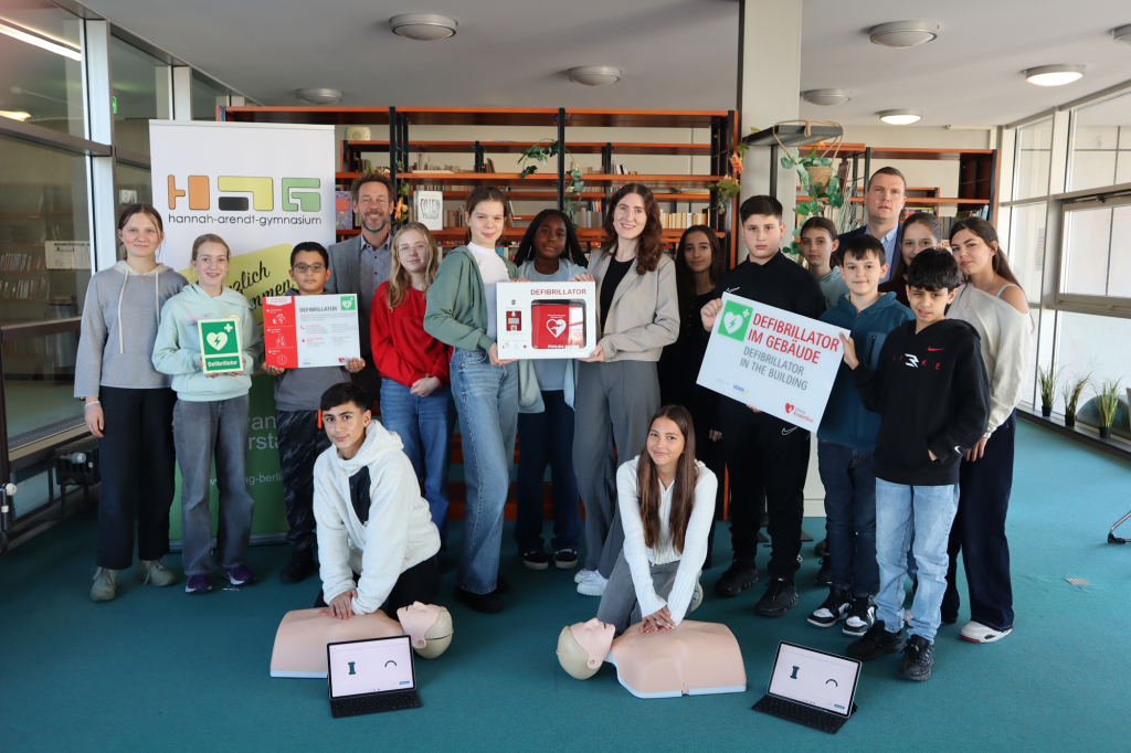 Mit großer Freude können wir mitteilen, dass das Hannah-Arendt-Gymnasium am 19.11.2025 im Rahmen der bundesweiten Initiative der Stiftung Kinderherz e.V. zur Ausstattung von Schulen und Kindergärten einen automatisierten Defibrillator erhielt. Damit gehen wir für die Schule, aber auch für die angrenzende Nachbarschaft im Frauenviertel Rudow einen großen Schritt in Richtung Sicherheit. Stellvertretend für die Schule nahmen Schülerinnen und Schüler der Klasse 7d das Gerät von Frau Linda Gaissmaier von der VEMA eG in Empfang, die als eigentliche Spenderin fungiert.